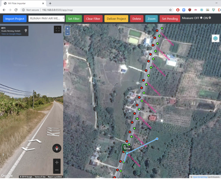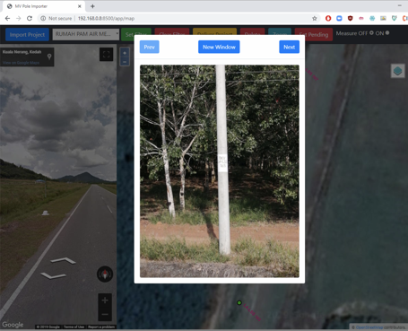 As part of the previous project “To collect TNB 33 kV and 11 kV Medium Voltage (MV) Poles between substations in Kedah, Perak and Perlis using handheld GPS”, a centralized GIS system was need to do the post-processing, validation, monitoring and automating the delivery process. Using opensource GIS technologies like Geoserver, PostgresSQL DB, gdal python libraries, the web application was built to migrate the field collected data and cross validate using Google Street View API which was also integrated in the web application.